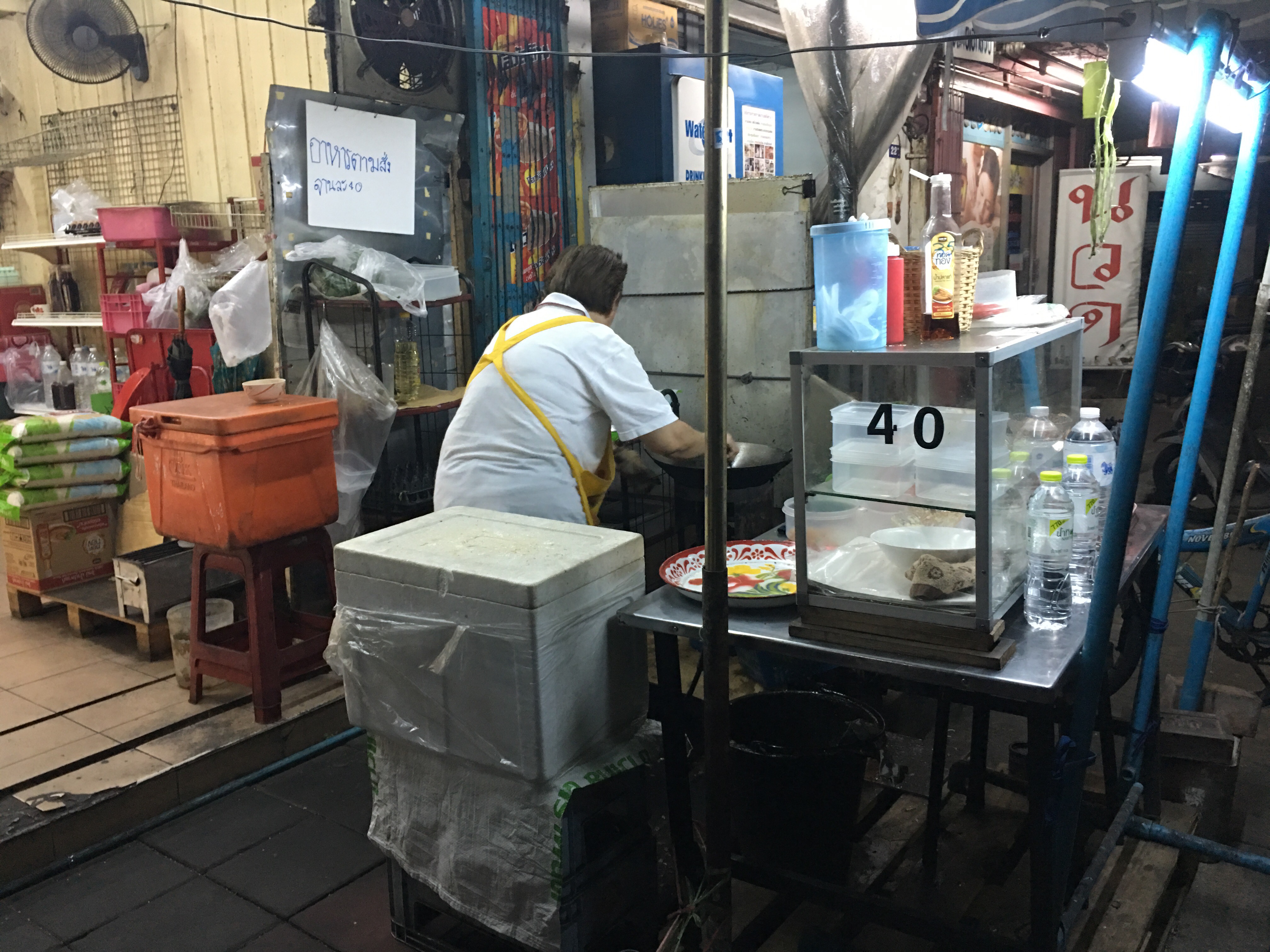 This woman cooked us up some delicious fried rice and chicken. All for 40 baht, or about $1.60 CAD. She had a system figured out – everything portioned out in containers, everything within reach. While she didn’t speak English (many people here do), she had a small menu book with photos of each dish ready to point at with the options pictured out below the dish. She ran the storefront with her husband and children, all of whom moved about throughout the small street and showed up when you wanted to order. We ended up visiting her for rice or noodles on multiple occasions.